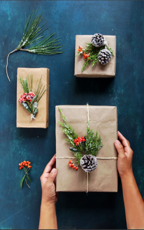 2. Nature Made: Here is a simple way to wrap your gifts that doubles as a fun activity for the kids! Take a walk outside and gather some leaves, flowers, or other botanicals to decorate your presents. This simple, yet chic wrapping requires some neutral brown recycled paper wrapped in twine and topped with mother nature.